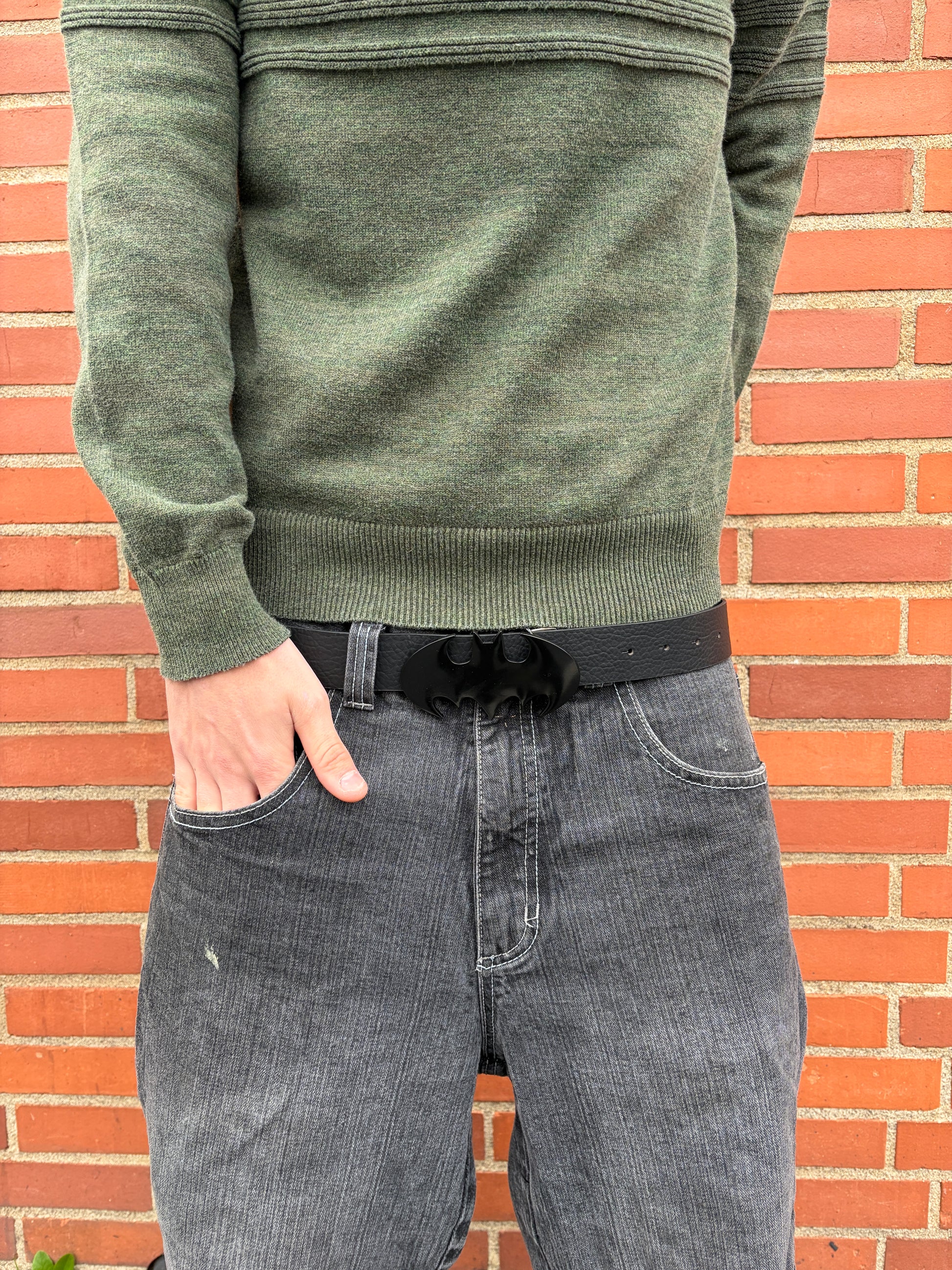 Style: Black Batman logo buckle on black belt