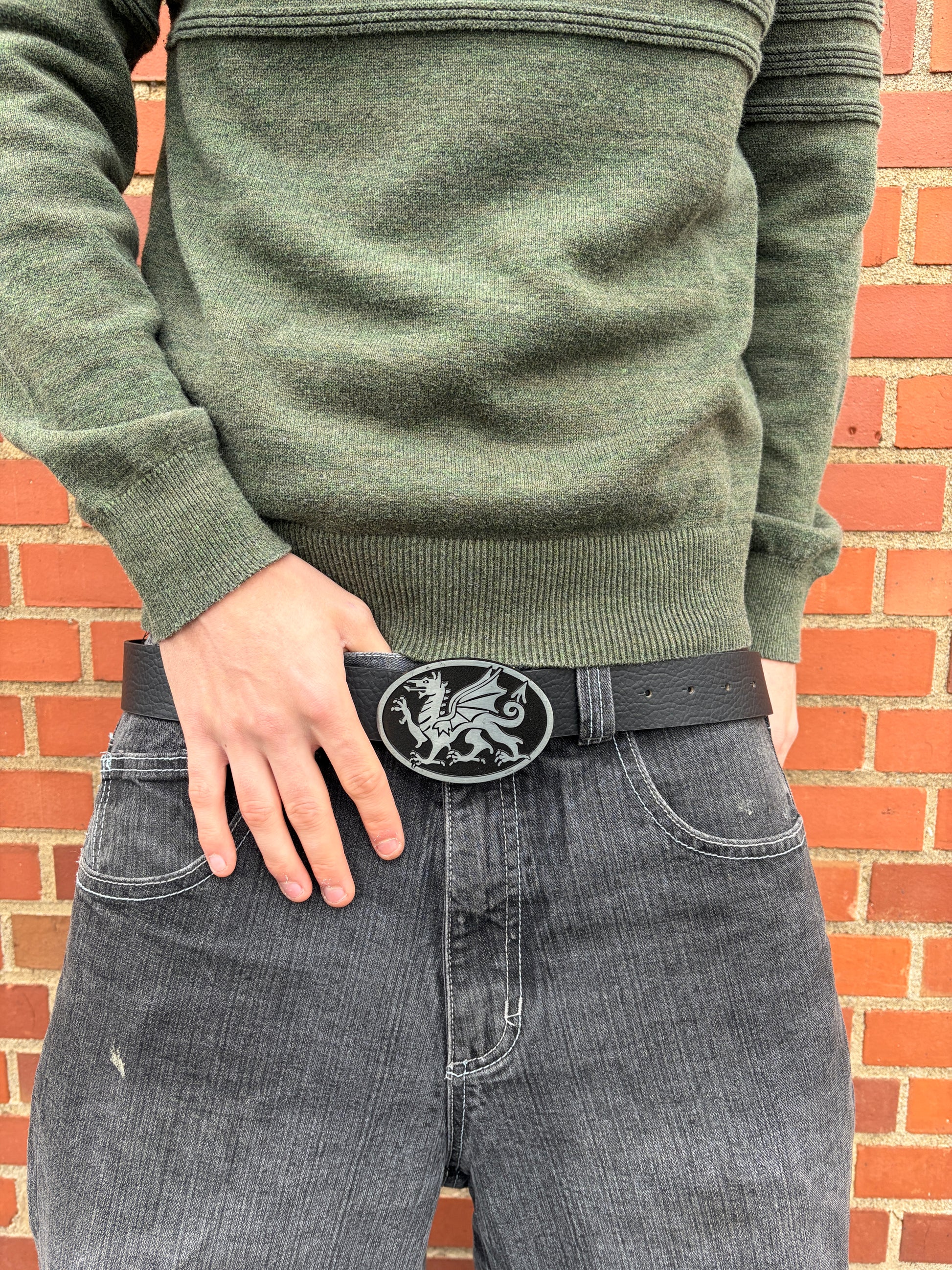 Style: Silver dragon buckle on black belt